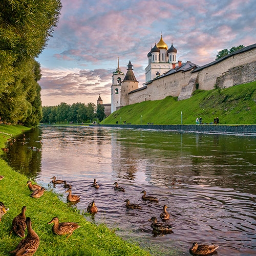 Кремль, памятники внутри стен Окольного города. Более чем 1500-летняя история города, памятники архитектуры, по которым в 1878 году Александр II отправил своих сыновей Павла и Сергея изучать историю России. Вы, как когда-то молодые великие князья, а также пожелавший присоединиться к ним Константин Константинович (К.Р.), обойдете неприступные в древности для врага псковские стены и башни, побываете в старинных церквах-крепостях со стенами метровой ширины.